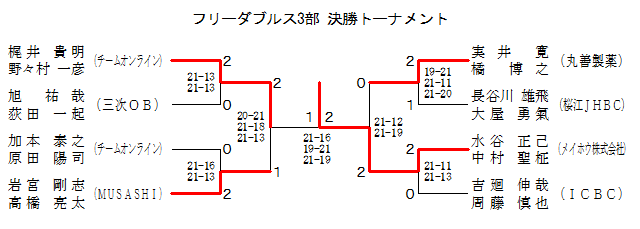 | フリーダブルス3部 Fブロック | 静間 坂本 | 須藤 御厨 | 秋原 木次 | 長谷川 大屋 | 安食 佐伯 | 順位 |
